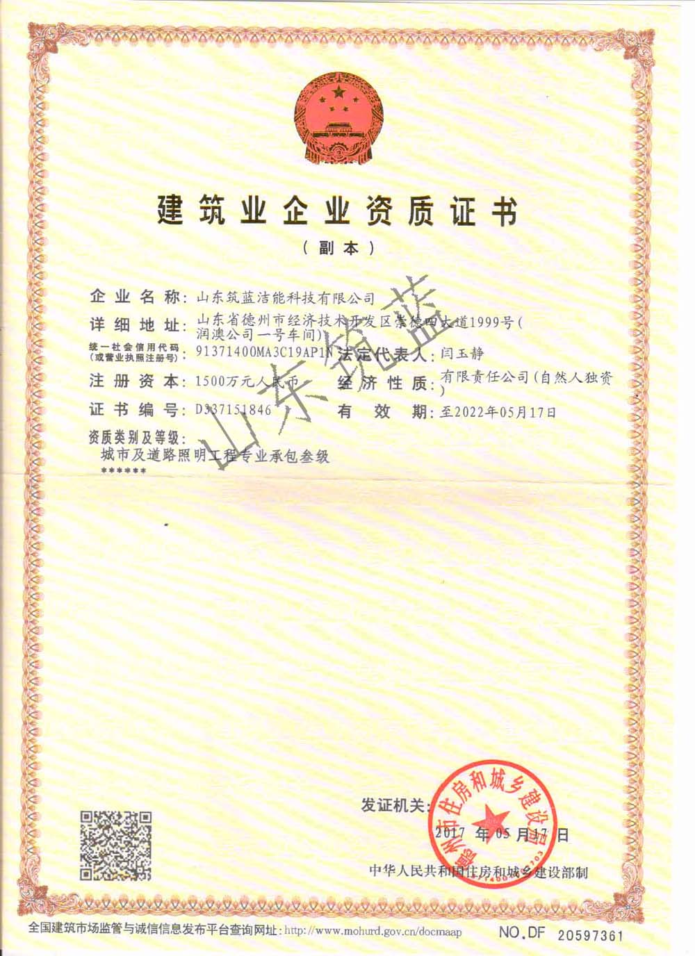 山東筑藍潔能科技有限公司創建于2015年,擁有建筑業企業資質證書--城市及道路照明工程專業承包叁級,是一家集設計、生產制造、安裝服務于一體的新能源企業,專業從事太陽能路燈、LED路燈、高桿燈、庭院燈、景觀燈、中華燈、草坪燈、光伏設備、風能發電設備的生產及銷售、安裝及售后服務;同時還從事凈水設備、空氣凈化器、光伏采暖設備、燃氣熱水器、機電設備、玻璃鋼制品的銷售、安裝,LED照明及亮化產品、太陽能熱水器、光伏設備及元器件生產、銷售、安裝;建筑裝飾裝修工程施工、兼建筑幕墻工程施工、建筑智能化工程施工等產品專業生產加工的公司,擁有完整、科學的質量管理體系。